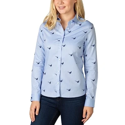 Rydale Ladies Oxford Cotton Printed Shirt Womens Button Shirts Blouse Animal Print (as8, Numeric, Numeric_10, Regular, Blue Pheasant)