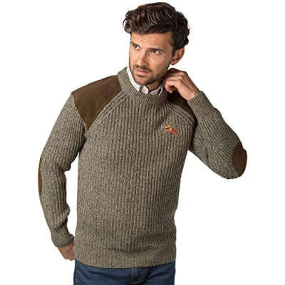 A beautiful soft men's crew neck jumper with an attractive pheasant motif on the chest Made from a mix of high quality, chunky knit wool and acrylic which has been designed with unbeatable insulation Shoulders and elbows have been reinforced with durable contrasting patches for that classic country style The cuffs and hem are ribbed for a stylish finish that holds the shape of the jumper It will give you fantastic levels of warmth combined with a soft luxurious touch