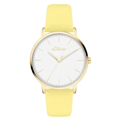 High-quality s.Oliver watch made of metal with faux leather strap and Japanese quality movement Polished metal housing, diameter 34 mm, scratch-resistant mineral glass, water resistance tested up to 3 ATM Elegant faux leather strap in yellow with pin buckle, length: 190 mm The s.Oliver watch collection impresses with its high quality and modern design. The s.Oliver watches are packaged in a beautiful, reusable cotton pouch.