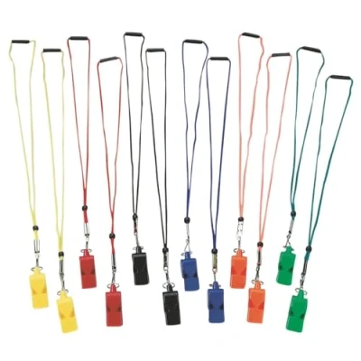 LOUD AND POWERFUL FOR EASE: One blow will stop the action quickly with this loud pealess whistle EACH WHISTLE MATHCES IT'S LANYARD: The black pealess whistle features a black breakaway lanyard with swivel clip THE PERFECT AMOUNT: Set includes 12 ABS molded plastic whistles with 20" long matching colored breakaway lanyards BE ABLE TO MATCH OR DIFFERENTIATE BASED ON THE ACTIVITY: Whistles come in 6 different colors, 2 of each color GET THEIR ATTENTION, GET THE CLASS MOVING: Perfect for gym class, sport practices, or games