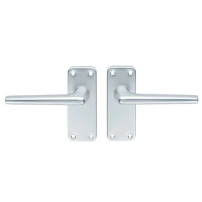 Pair of spring loaded aluminum door handles Dimensions of the back plate 100 mm x 38 mm (lever length 100 mm) 0 blister packed Complete with screws and spindle, Manufacturer: Carlisle Brass