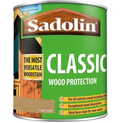 General description Sadolin Classic Wood Protection in Light Oak is designed to deeply absorb into timber, providing exceptional weather protection. It is effective for large timber areas such as cladding, fascias, decking, and rough sawn timber. This product is also suitable as a base stain for new joinery that will be treated with Sadolin Extra. Technical specifications Colour: Light Oak Size: 1 litre Type: Woodstain Coverage: Planed Softwood/Hardwood up to 15m²/litre; Rough Sawn Timber up to 8m²/litre Drying Time: Touch Dry 4-6 hours; Recoat 16-24 hours Usage Apply by brush Recommended for use on exterior and interior wood surfaces Ideal for decking, fencing, cladding, and garden furniture Can be used as a basecoat for new doors and windows, followed by overcoating with Sadolin Extra or other Sadolin products Other information