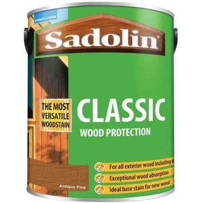 General description This Sadolin Classic Wood Protection in Antique Pine is a high-quality wood treatment designed to deeply penetrate timber, providing exceptional protection against weathering. It is suitable for large areas of timber, including cladding, fascias, decking, and rough sawn timber. This product can also serve as a base stain for new joinery that will be treated with Sadolin Extra. Technical specifications Colour: Antique Pine Size: 5 litre Coverage: Planed Softwood/Hardwood up to 15m²/litre; Rough Sawn Timber up to 8m²/litre Drying Time: Touch Dry 4-6 hours Recoat Time: 16-24 hours Compatibility and accessories Ideal as a basecoat for new doors and windows, which can be overcoated with Sadolin Extra, Sadolin Clearcoat, Sadolin Yacht Varnish, or Sadolin Outdoor Varnish. Can be used alone or alongside other products for an exceptional finish. Usage Apply by brush. Recommended to use 2 coats for optimal protection.
