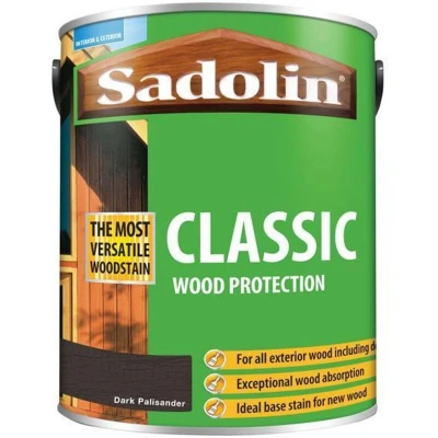 General description Sadolin Classic Wood Protection is a high-quality woodstain designed to provide exceptional protection against the weather. It absorbs deeply into the timber, making it ideal for large areas of timber such as cladding, fascias, decking, and rough sawn timber. This product is also suitable as a base stain for new joinery that will be treated with Sadolin Extra. Technical specifications Colour: Dark Palisander Size: 5 litre Coverage: Planed Softwood/Hardwood up to 15m²/litre; Rough Sawn Timber up to 8m²/litre Drying Time: Touch Dry 4-6 hours Recoat Time: 16-24 hours MPN: 5028477 EAN: 5721147660937 Other information