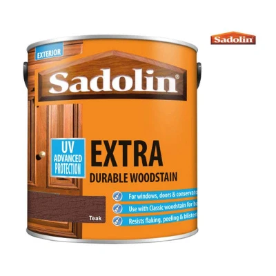 Experience long-lasting protection for your windows, doors, and conservatories by utilising Sadolin Extra Durable Woodstain. With a range of colour options and styles available for purchase, this resilient solution effectively resists flaking, peeling, and blistering, ensuring that your joinery remains in excellent condition.Sadolin Extra Durable Woodstain offers flexibility and water repellence, defending both softwood and hardwood products while also adding a translucent semi-gloss sheen. However, it is not suitable for areas exposed to heavy wear and abrasion, such as decking. Features & Benefits: Sadolin Extra Durable Woodstain 2.5l - Teak, 2.5 litres, Touch dry in four to six hours, Can be recoated after 16 to 24 hours, Perfect for windows, doors, conservatories, Works well in conjunction with Sadolin Classic, Water-repellent, durable and heard-wearing, Finishing or maintenance coat, Coverage per coat of up to 15m/litre for planed softwood and hardwood joineryFor ultimate durability, particularly for hardwoods, it is advised that you use this product in conjunction with Sadolin Classic. In this application, Sadolin Classic acts as the base coat, while Sadolin Extra serves as the finishing coat.If you're looking for a quality golden brown colour for your wooden surface, the Teak colour from the Sadolin Extra range is an ideal solution for you. Please note: , Colours represented online may not be a perfect match to the colours in the tin that you purchase.. Sadolin Extra Durable Woodstain 2.5l - Teak