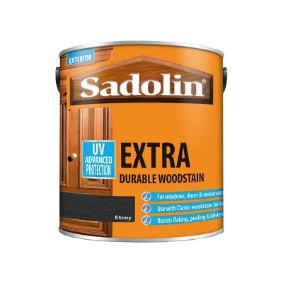 Experience long-lasting protection for your windows, doors, and conservatories by utilising Sadolin Extra Durable Woodstain. With a range of colour options and styles available for purchase, this resilient solution effectively resists flaking, peeling, and blistering, ensuring that your joinery remains in excellent condition.Sadolin Extra Durable Woodstain offers flexibility and water repellence, defending both softwood and hardwood products while also adding a translucent semi-gloss sheen. However, it is not suitable for areas exposed to heavy wear and abrasion, such as decking. Features & Benefits: Sadolin Extra Durable Woodstain 2.5l - Ebony, 2.5 litres, Touch dry in four to six hours, Can be recoated after 16 to 24 hours, Perfect for windows, doors, conservatories, Works well in conjunction with Sadolin Classic, Water-repellent, durable and heard-wearing, Finishing or maintenance coat, Coverage per coat of up to 15m/litre for planed softwood and hardwood joineryFor ultimate durability, particularly for hardwoods, it is advised that you use this product in conjunction with Sadolin Classic. In this application, Sadolin Classic acts as the base coat, while Sadolin Extra serves as the finishing coat.The rich-looking Sadolin Extra Ebony colour will add a deep and distinctive tone to your wood, giving a premium look. Please note: , Colours represented online may not be a perfect match to the colours in the tin that you purchase.. Sadolin Extra Durable Woodstain 2.5l - Ebony