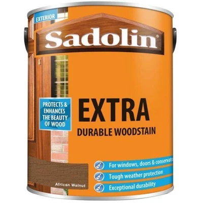 General description This Sadolin Extra Durable Woodstain in African Walnut is designed for both softwood and hardwood surfaces, excluding decking or areas subjected to heavy wear. It is particularly effective for joinery applications such as doors and windows, offering flexible protection and water repellency for long-lasting results. Technical specifications Colour: African Walnut Size: 5 litre Coverage: Planed Softwood/Hardwood up to 15m²/litre Drying Time: Touch Dry 4-6 hours Recoat Time: 16-24 hours No of Coats: 2 coats Compatibility and accessories Recommended base coat: Sadolin Classic for optimum durability on new wood, especially hardwoods Installation Application method: Apply by brush Usage Ideal for windows, doors, and conservatories Resists flaking, peeling, and blistering Provides premium protection on new wood