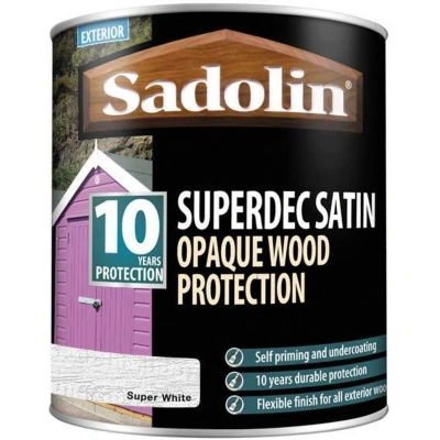 General description Sadolin Superdec Satin Opaque Wood Protection is a water-borne, highly durable opaque finish designed for wood, weathered plastic, steel, cladding, concrete, masonry, and exterior joinery. It provides self-priming and undercoating capabilities with a flexible finish that ensures 10 years of durable protection. The product erodes naturally through weathering, maintaining flexibility and resisting cracking, peeling, and flaking. It can be applied to both new and previously painted or stained surfaces, making it ideal for complete color changes or for weathered surfaces that require rejuvenation. Technical specifications Colour/Finish: Super White Satin Size: 1 Litre Coverage: Planed Softwood: up to 10m²/litre Drying Time: Touch Dry: 4 - 6 hours, Re-coat: 16 hours No of Coats: 3 coats Compatibility and accessories For very resinous timber, a blocking primer is recommended to minimize extractive discolouration, especially with white and pale shades. Installation Apply
