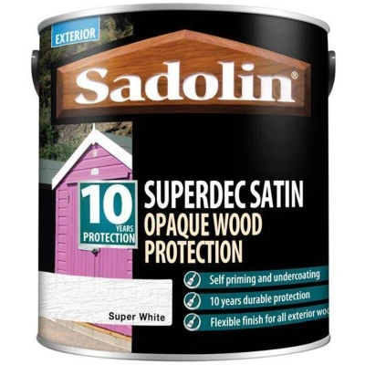 This Sadolin Superdec Opaque Wood Protection delivers ten years of protection for your cladding or exterior joinery. Providing a flexible finish for exterior wood, this highly durable product is resistant to cracking, peeling and flaking.This Superdec Opaque Wood Protection from Sadolin can be used on previously painted or stained surfaces as well as new ones. In fact, it is ideal for cases where a complete change of colour is needed or when the surface has begun to look weathered and uneven.Features & Benefits: Sadolin Superdec Opaque Wood Protection 2.5l - Super White, Water-borne, Self-priming and undercoating, Highly durable, For use on new or old surfaces, Available in a variety of colours and finishes, Up to 10m/litre coverage per coat on planed softwood, 1-hour touch dry time, 16-hour recoat drying timeIn the event of very resinous timber, it is recommended that a blocking primer is used to minimise extractive discolouration of the coating. This is especially important for white and pale shades of this Sadolin Superdec.If youre looking to bring a wooden surface back to life with a fresh look, this Sadolin Superdec Opaque Wood Protection in White is a perfect choice.Please note: , The colours represented on the website may not match the exact colours in the can of wood stain you purchase.. Sadolin Superdec Opaque Wood Protection 2.5l - Super White