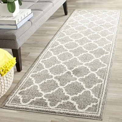TRENDY STYLE: Moroccan Trellis rug design from the Safavieh Amherst Collection woven in Turkey beautifully enhances any room of the home, from the living room, dining room, bedroom, home office, or entryway; available in many colors and sizes OPTIMAL QUALITY & DURABLE DESIGN: Woven of 67% Polypropylene / 18% Fibrillated Polypropylene / 8% Latex / 7% Poly-Cotton this machine made area rug has a plush & comfortable 0.95 cm low pile and is soft underfoot STAIN RESISTANT & FAMILY-FRIENDLY: Expertly woven from enhanced soft synthetic durable fibers that are stain resistant and non-shedding, the rug doesn't trap dirt or debris making it pet-friendly and easy to clean; optimal for high traffic areas EASY CARE & MAINTENANCE: Outdoor rugs are made from fibers that are water and stain resistant and deter mildew to withstand natural weather elements; rinse with a garden hose to remove excessive grime; dry over a railing in the sun on both sides. TRUSTED BRAND: SAFAVIEH has been a trusted brand and leader in home furnishings for over 100 years, using their specialty and expertise in crafting the trendiest and optimal qualitydesigns and selection of colors; begin your rug search with SAFAVIEH and explore over 100,000 products today