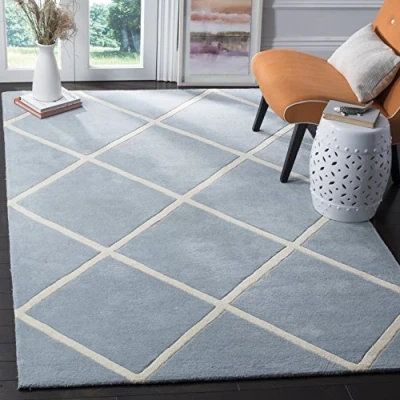 TRENDY STYLE: Contemporary rug design from the Safavieh Chatham Collection hand tufted in India beautifully enhances any room of the home, from the living room, dining room, bedroom, home office, or entryway. Available in many colors and sizes. HIGH QUALITY & DURABLE DESIGN: Woven of 100% Wool Pile this hand tufted area rug has a plush & comfortable 1.2 cm medium pile and is soft underfoot. STAIN RESISTANT & FAMILY-FRIENDLY: Beautifully hand tufted from artisans of the highest quality, soft and dense wool, this carpet is comfortable underfoot. Given the nature of the fibers, this rug is less susceptible to stains. EASY CARE & MAINTENANCE: Vacuum regularly and gently blot and clean stains immediately with a mild detergent or carpet cleaner, then rinse thoroughly and dry. Professional cleaning recommended for tough stains and dirt. THE BRAND: Safavieh has been a trusted brand and global leader in home & living for over 100 Years. Experts in making quality, durable, trendy designs, the brand mixes materials, colors and styles to create a collection of rugs, furniture and lights Construction Type: Hand Tufted; Materials 100% Wool Size: 121 X 182 cm; Colour: Blue / Ivory Vacuum regularly to prevent dust and crumbs from settling into the roots of the fibres. Avoid direct and continuous exposure to sunlight. Use rug protectors under the legs of heavy furniture to avoid flattening piles. Do not pull loose ends; clip them with scissors to remove. Turn carpet occasionally to equalize wear. Remove spills immediately. Professional cleaning is recommended.