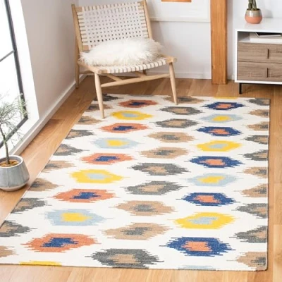TRENDY STYLE: Contemporary rug design from the Safavieh Dhurrie Collection flatweave in India beautifully enhances any room of the home, from the living room, dining room, bedroom, home office, or entryway. Available in many colors and sizes. HIGH QUALITY & DURABLE DESIGN: Woven of Wool & Viscose this hand made area rug has a plush & comfortable 0.5 cm low pile and is soft underfoot. STAIN RESISTANT & FAMILY-FRIENDLY: Beautifully hand tufted from artisans of the highest quality, soft and dense wool, this carpet is comfortable underfoot. Given the nature of the fibers, this rug is less susceptible to stains. EASY CARE & MAINTENANCE: Vacuum regularly and gently blot and clean stains immediately with a mild detergent or carpet cleaner, then rinse thoroughly and dry. Professional cleaning recommended for tough stains and dirt. THE BRAND: Safavieh has been a trusted brand and global leader in home & living for over 100 Years. Experts in making quality, durable, trendy designs, the brand mixes materials, colors and styles to create a collection of rugs, furniture and lights Construction Type: Hand Woven Flat Weave; Materials Wool and Cotton Size: 121 X 182 cm; Colour: Ivory / Multi Vacuum regularly to prevent dust and crumbs from settling into the roots of the fibres. Avoid direct and continuous exposure to sunlight. Use rug protectors under the legs of heavy furniture to avoid flattening piles. Do not pull loose ends; clip them with scissors to remove. Turn carpet occasionally to equalize wear. Remove spills immediately. Professional cleaning is recommended.