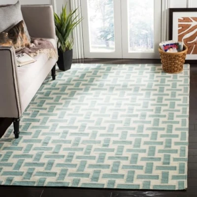 TRENDY STYLE: Contemporary rug design from the Safavieh Dhurrie Collection flatweave in India beautifully enhances any room of the home, from the living room, dining room, bedroom, home office, or entryway. Available in many colors and sizes. HIGH QUALITY & DURABLE DESIGN: Woven of Wool this hand made area rug has a plush & comfortable 0.5 cm low pile and is soft underfoot. STAIN RESISTANT & FAMILY-FRIENDLY: Beautifully hand tufted from artisans of the highest quality, soft and dense wool, this carpet is comfortable underfoot. Given the nature of the fibers, this rug is less susceptible to stains. EASY CARE & MAINTENANCE: Vacuum regularly and gently blot and clean stains immediately with a mild detergent or carpet cleaner, then rinse thoroughly and dry. Professional cleaning recommended for tough stains and dirt. THE BRAND: Safavieh has been a trusted brand and global leader in home & living for over 100 Years. Experts in making quality, durable, trendy designs, the brand mixes materials, colors and styles to create a collection of rugs, furniture and lights Construction Type: Hand Woven Flat Weave; Materials 100% Wool Size: 121 X 182 cm; Colour: Turquoise / Ivory Vacuum regularly to prevent dust and crumbs from settling into the roots of the fibres. Avoid direct and continuous exposure to sunlight. Use rug protectors under the legs of heavy furniture to avoid flattening piles. Do not pull loose ends; clip them with scissors to remove. Turn carpet occasionally to equalize wear. Remove spills immediately. Professional cleaning is recommended.