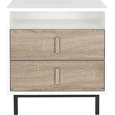 Safavieh 2-Drawer Lacquer Cabinet. Perfect for the Living Room, Dining Room, Family Room, Den, Library or Study/Office. Color: White, Oak With Black Iron Legs ; Product Dimensions: 39.624 X 54.102 X 59.944 cm Wood Content: Medium-density fibreboard Assembly Required: No ; Country of Origin: China Wood is a natural material with variations of color shade, configuration, streaks, and grain structure. Each individual piece of Safavieh furniture has characteristic markings that will differ from photo and showroom samples. Regular attention and maintenance of fine furniture can ensure its beauty for years to come. Always use felt pads under all articles to prevent discoloration or softening of any lacquer surfaces such as hardwood floors or tiles. Plastic and rubber bases on items can discolor wood. Frequently dust with a clean, lint-free cloth or feather duster. Avoid the use of chemicals and household cleaners as they may damage the finish.