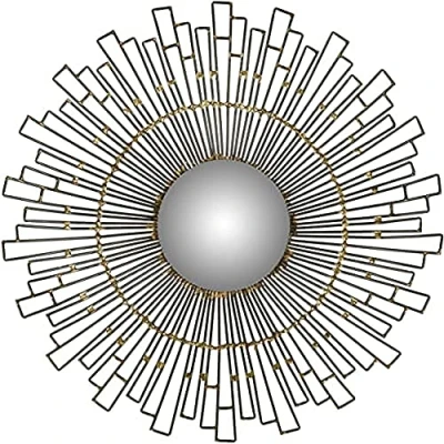 Safavieh Sunburst Wall Iron Mirror. The Perfect Finishing Touch for the Living Room, Dining Room, Family Room, Entryway or Study/Office. Acts As An Accent Piece, Focal Point or Functional Décor. Color: Gold ; Product Dimensions: 2 X 53 X 76.2 cm Material: Iron & Aluminum Assembly Required: No ; Country of Origin: India Blot spills immediately. Maintain with regular dusting and wipe with mild soap and water, dry thoroughly and do not use brass cleaners or abrasive household chemicals to avoid damage to the finish. For a natural streak-free shine, use a soft lint-free cloth and a small amount of 1:1 ratio white vinegar and water to clean. Non-streaking glass cleaners may also be used.