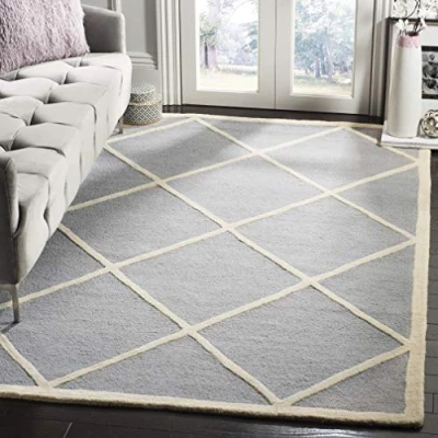 TRENDY STYLE: Diamond rug design from the Safavieh Cambridge Collection hand tufted in India beautifully enhances any room of the home, from the living room, dining room, bedroom, home office, or entryway. Available in many colors and sizes. HIGH QUALITY & DURABLE DESIGN: Woven of 100% Wool Pile this hand tufted area rug has a plush & comfortable 1.2 cm medium pile and is soft underfoot. STAIN RESISTANT & FAMILY-FRIENDLY: Beautifully hand tufted from artisans of the highest quality, soft and dense wool, this carpet is comfortable underfoot. Given the nature of the fibers, this rug is less susceptible to stains. EASY CARE & MAINTENANCE: Vacuum regularly and gently blot and clean stains immediately with a mild detergent or carpet cleaner, then rinse thoroughly and dry. Professional cleaning recommended for tough stains and dirt. THE BRAND: Safavieh has been a trusted brand and global leader in home & living for over 100 Years. Experts in making quality, durable, trendy designs, the brand mixes materials, colors and styles to create a collection of rugs, furniture and lights Construction Type: Hand Tufted; Materials 100% Wool Size: 121 X 182 cm; Colour: Silver / Ivory Vacuum regularly to prevent dust and crumbs from settling into the roots of the fibres. Avoid direct and continuous exposure to sunlight. Use rug protectors under the legs of heavy furniture to avoid flattening piles. Do not pull loose ends; clip them with scissors to remove. Turn carpet occasionally to equalize wear. Remove spills immediately. Professional cleaning is recommended.