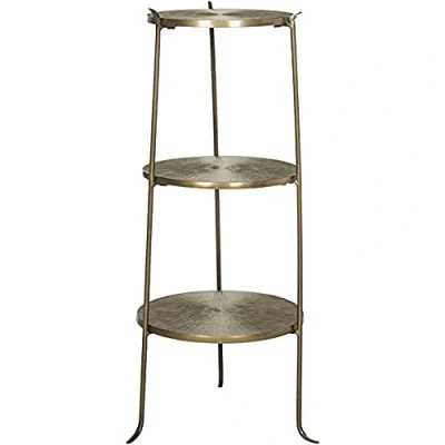 Safavieh Elegant 3-Tier Side Table. Perfect for the Living Room, Dining Room, Family Room, Den, Library or Study/Office. Color: Brass ; Product Dimensions: 35 X 35 X 80.01 cm Finish: Aluminum & Iron With Brass Antique Assembly Required: Yes ; Country of Origin: India Blot up spills immediately, use coasters under beverages. Use trivets or mats under hot dishes or cookware. Clean with warm water and dry surface immediately after cleaning with a soft, clean absorbent cloth. Do not use abrasive cleaners that may contain acid such as bathroom cleaners, grout cleaner or tile cleaners. Maintain with regular dusting.