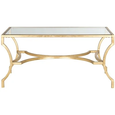 Safavieh Elegant Coffee Table. Perfect for the Living Room, Dining Room, Family Room, Den, Library or Study/Office. Color: Gold With Clear Glass Top ; Product Dimensions: 93 X 50 X 43.18 cm Finish: Durable Iron With Gold Leaf Lacquer Coating Assembly Required: Yes ; Country of Origin: China Blot spills immediately. Maintain with regular dusting and wipe with mild soap and water, dry thoroughly and do not use brass cleaners or abrasive household chemicals to avoid damage to the finish. For a natural streak-free shine, use a soft lint-free cloth and a small amount of 1:1 ratio white vinegar and water to clean. Non-streaking glass cleaners may also be used.