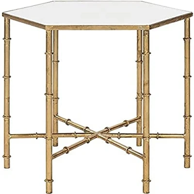 Safavieh Modern Accent Table. Perfect for the Living Room, Dining Room, Family Room, Den, Library or Study/Office. Color: Gold With Mirror Glass Top ; Product Dimensions: 50 X 43 X 43.18 cm Finish: Durable Iron With Gold Leaf Lacquer Coating Assembly Required: No ; Country of Origin: China Blot spills immediately. Maintain with regular dusting and wipe with mild soap and water, dry thoroughly and do not use brass cleaners or abrasive household chemicals to avoid damage to the finish. For a natural streak-free shine, use a soft lint-free cloth and a small amount of 1:1 ratio white vinegar and water to clean. Non-streaking glass cleaners may also be used.