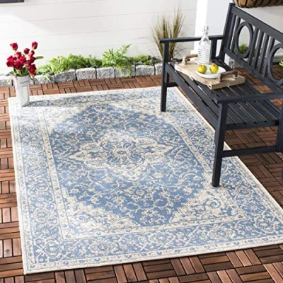 TRENDY STYLE: Medallion rug design from the Safavieh Beachhouse Collection woven in Ukraine enhances any outdoor space. This durable design can also be used for kitchen, playroom, nursery or any high traffic area. Available in many colors and sizes. HIGH QUALITY & DURABLE DESIGN: Woven of 80% Polypropylene / 20% Polyester this machine made area rug has a plush & comfortable 0.05 cm low pile and is soft underfoot. STAIN RESISTANT & FAMILY-FRIENDLY: Expertly woven from enhanced soft synthetic durable fibers that are stain resistant and non-shedding, the rug doesn't trap dirt or debris making it pet-friendly and easy to clean. Perfect for high traffic areas. EASY CARE & MAINTENANCE: Outdoor rugs are made from fibers that are water and stain resistant and deter mildew to withstand natural weather elements. Rinse with a garden hose to remove excessive grime. Dry over a railing in the sun on both sides. THE BRAND: Safavieh has been a trusted brand and global leader in home & living for over 100 Years. Experts in making quality, durable, trendy designs, the brand mixes materials, colors and styles to create a collection of rugs, furniture and lights