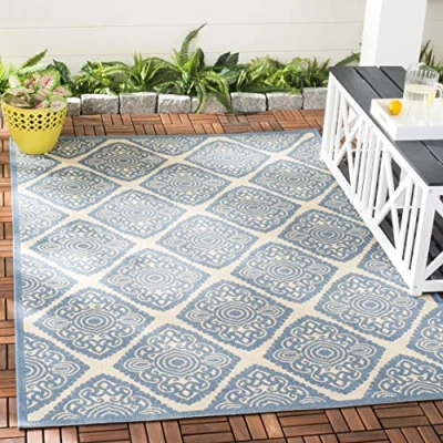 TRENDY STYLE: Medallion rug design from the Safavieh Beachhouse Collection woven in Ukraine enhances any outdoor space. This durable design can also be used for kitchen, playroom, nursery or any high traffic area. Available in many colors and sizes. HIGH QUALITY & DURABLE DESIGN: Woven of 80% Polypropylene / 20% Polyester this machine made area rug has a plush & comfortable 0.05 cm low pile and is soft underfoot. STAIN RESISTANT & FAMILY-FRIENDLY: Expertly woven from enhanced soft synthetic durable fibers that are stain resistant and non-shedding, the rug doesn't trap dirt or debris making it pet-friendly and easy to clean. Perfect for high traffic areas. EASY CARE & MAINTENANCE: Outdoor rugs are made from fibers that are water and stain resistant and deter mildew to withstand natural weather elements. Rinse with a garden hose to remove excessive grime. Dry over a railing in the sun on both sides. THE BRAND: Safavieh has been a trusted brand and global leader in home & living for over 100 Years. Experts in making quality, durable, trendy designs, the brand mixes materials, colors and styles to create a collection of rugs, furniture and lights