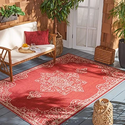 TRENDY STYLE: Medallion rug design from the Safavieh Beachhouse Collection woven in Ukraine enhances any outdoor space. This durable design can also be used for kitchen, playroom, nursery or any high traffic area. Available in many colors and sizes. HIGH QUALITY & DURABLE DESIGN: Woven of 80% Polypropylene / 20% Polyester this machine made area rug has a plush & comfortable 0.05 cm low pile and is soft underfoot. STAIN RESISTANT & FAMILY-FRIENDLY: Expertly woven from enhanced soft synthetic durable fibers that are stain resistant and non-shedding, the rug doesn't trap dirt or debris making it pet-friendly and easy to clean. Perfect for high traffic areas. EASY CARE & MAINTENANCE: Outdoor rugs are made from fibers that are water and stain resistant and deter mildew to withstand natural weather elements. Rinse with a garden hose to remove excessive grime. Dry over a railing in the sun on both sides. THE BRAND: Safavieh has been a trusted brand and global leader in home & living for over 100 Years. Experts in making quality, durable, trendy designs, the brand mixes materials, colors and styles to create a collection of rugs, furniture and lights