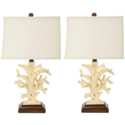Safavieh Coral Coral Table Lamp. Perfect for the Living Room, Dining Room, Family Room, Den, Library or Study/Office. Note: Light Bulbs Not Included. Sold as a pair. Color: Off-White Shade With Cream & Brown Resin Body ; Product Dimensions: 12 X 22 X 53.34 cm Wood Content: Medium-density fibreboard ; Upholstery Content: 100% Cotton Shade Assembly Required: Yes ; Country of Origin: China Before cleaning any lamp shade or fixture, disconnect the power source. Wipe with a soft, dry cloth. Avoid the use of chemicals and household cleaners as they may damage the finish. To maintain, dust regularly with a feather duster or a soft dry cloth.