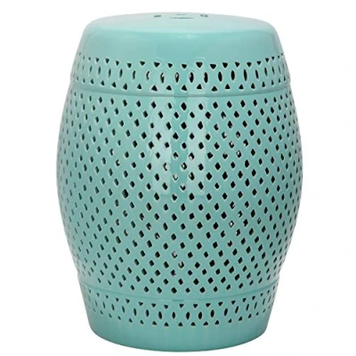 Safavieh Versatile Accent Stool. Use it as a traditional garden stool, garden sculpture or as a side table indoors or out on the terrace, patio or deck. Crafted of glazed ceramic with elegant details. Color: Soft Turquoise ; Product Dimensions: 33 X 33 X 45.72 cm Material: Glazed Ceramic Assembly Required: No ; Country of Origin: China Wipe with damp cloth. Avoid the use of chemicals and household cleaners as they may damage the finish. Suitable for outdoor use, avoid extreme temperature and store indoors during long periods of inclement weather.