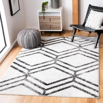 TRENDY STYLE: Modern Geometric rug design from the Safavieh Adirondack Collection woven in Turkey beautifully enhances any room of the home, from the living room, dining room, bedroom, home office, or entryway. Available in many colors and sizes. HIGH QUALITY & DURABLE DESIGN: Woven of 100% Polypropylene Pile this machine made area rug has a plush & comfortable 1.1 cm low pile and is soft underfoot. STAIN RESISTANT & FAMILY-FRIENDLY: Expertly woven from enhanced soft synthetic durable fibers that are stain resistant and non-shedding, the rug doesn't trap dirt or debris making it pet-friendly and easy to clean. Perfect for high traffic areas. EASY CARE & MAINTENANCE: Vacuum regularly and gently blot and clean stains immediately with a mild detergent or carpet cleaner, then rinse thoroughly and dry. Professional cleaning recommended for tough stains and dirt. THE BRAND: Safavieh has been a trusted brand and global leader in home & living for over 100 Years. Experts in making quality, durable, trendy designs, the brand mixes materials, colors and styles to create a collection of rugs, furniture and lights