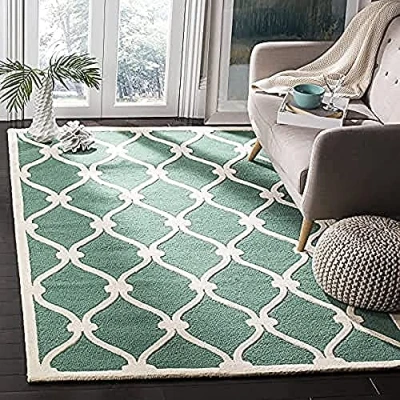 TRENDY STYLE: Modern rug design from the Safavieh Cambridge Collection hand tufted in India beautifully enhances any room of the home, from the living room, dining room, bedroom, home office, or entryway. Available in many colors and sizes. HIGH QUALITY & DURABLE DESIGN: Woven of 100% Wool Pile this hand tufted area rug has a plush & comfortable 1.2 cm medium pile and is soft underfoot. STAIN RESISTANT & FAMILY-FRIENDLY: Beautifully hand tufted from artisans of the highest quality, soft and dense wool, this carpet is comfortable underfoot. Given the nature of the fibers, this rug is less susceptible to stains. EASY CARE & MAINTENANCE: Vacuum regularly and gently blot and clean stains immediately with a mild detergent or carpet cleaner, then rinse thoroughly and dry. Professional cleaning recommended for tough stains and dirt. THE BRAND: Safavieh has been a trusted brand and global leader in home & living for over 100 Years. Experts in making quality, durable, trendy designs, the brand mixes materials, colors and styles to create a collection of rugs, furniture and lights Construction Type: Hand Tufted; Materials 100% Wool Size: 182 X 274 cm; Colour: Teal / Ivory Vacuum regularly to prevent dust and crumbs from settling into the roots of the fibres. Avoid direct and continuous exposure to sunlight. Use rug protectors under the legs of heavy furniture to avoid flattening piles. Do not pull loose ends; clip them with scissors to remove. Turn carpet occasionally to equalize wear. Remove spills immediately. Professional cleaning is recommended.