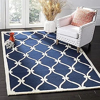 TRENDY STYLE: Modern rug design from the Safavieh Cambridge Collection hand tufted in India beautifully enhances any room of the home, from the living room, dining room, bedroom, home office, or entryway. Available in many colors and sizes. HIGH QUALITY & DURABLE DESIGN: Woven of 100% Wool Pile this hand tufted area rug has a plush & comfortable 1.2 cm medium pile and is soft underfoot. STAIN RESISTANT & FAMILY-FRIENDLY: Beautifully hand tufted from artisans of the highest quality, soft and dense wool, this carpet is comfortable underfoot. Given the nature of the fibers, this rug is less susceptible to stains. EASY CARE & MAINTENANCE: Vacuum regularly and gently blot and clean stains immediately with a mild detergent or carpet cleaner, then rinse thoroughly and dry. Professional cleaning recommended for tough stains and dirt. THE BRAND: Safavieh has been a trusted brand and global leader in home & living for over 100 Years. Experts in making quality, durable, trendy designs, the brand mixes materials, colors and styles to create a collection of rugs, furniture and lights Construction Type: Hand Tufted; Materials 100% Wool Size: 182 X 274 cm; Colour: Navy / Ivory Vacuum regularly to prevent dust and crumbs from settling into the roots of the fibres. Avoid direct and continuous exposure to sunlight. Use rug protectors under the legs of heavy furniture to avoid flattening piles. Do not pull loose ends; clip them with scissors to remove. Turn carpet occasionally to equalize wear. Remove spills immediately. Professional cleaning is recommended.