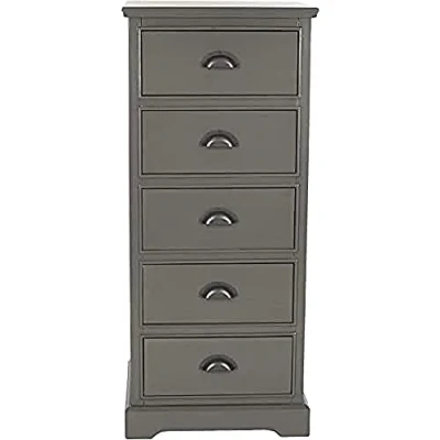 Safavieh Wooden Five-Drawer Chest. Perfect for the Living Room, Dining Room, Family Room, Den, Library or Study/Office. Color: Grey ; Product Dimensions: 43 X 33 X 104.14 cm Wood Content: Pine Wood Assembly Required: Yes ; Country of Origin: China Wood is a natural material with variations of color shade, configuration, streaks, and grain structure. Each individual piece of Safavieh furniture has characteristic markings that will differ from photo and showroom samples. Regular attention and maintenance of fine furniture can ensure its beauty for years to come. Always use felt pads under all articles to prevent discoloration or softening of any lacquer surfaces such as hardwood floors or tiles. Plastic and rubber bases on items can discolor wood. Frequently dust with a clean, lint-free cloth or feather duster. Avoid the use of chemicals and household cleaners as they may damage the finish.