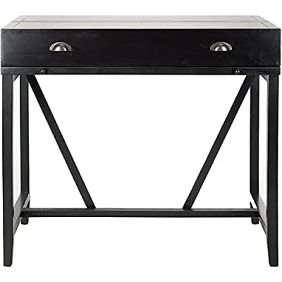 Safavieh Wooden Writing Desk With Pull Out Shelves. Perfect for the Living Room, Dining Room, Family Room, Den, Library or Study/Office. Color: Black ; Product Dimensions: 55 X 102 X 91.44 cm Wood Content: Pine Wood Assembly Required: Yes ; Country of Origin: China Wood is a natural material with variations of color shade, configuration, streaks, and grain structure. Each individual piece of Safavieh furniture has characteristic markings that will differ from photo and showroom samples. Regular attention and maintenance of fine furniture can ensure its beauty for years to come. Always use felt pads under all articles to prevent discoloration or softening of any lacquer surfaces such as hardwood floors or tiles. Plastic and rubber bases on items can discolor wood. Frequently dust with a clean, lint-free cloth or feather duster. Avoid the use of chemicals and household cleaners as they may damage the finish.