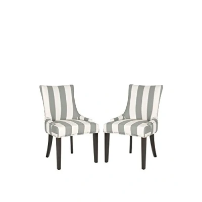 Includes (2) Safavieh Contemporary Dining Chairs. Perfect for the Living Room, Dining Room, Family Room, Den, Library or Study/Office. Legs Are In The Zipper Compartment Beneath The Seat Of The Chair For Assembly. Color: Grey & Bone Stripes With Espresso Finish Legs ; Product Dimensions: 62.99 X 55.88 X 92.45 cm Wood Content: Birchwood ; Upholstery Content: 70% Polyester, 30% Linen Assembly Required: Yes ; Country of Origin: China To prevent overall soiling, frequent vacuuming or light brushing is recommended. Spot clean, using a mild water-free solvent or dry cleaning product. Only a professional cleaner should undertake a complete overall cleaning. The use of steam or water-based cleaners may cause excessive shrinking or staining. Dust regularly with a soft, dry cloth. Never use oiled or treated cloths on lacquered finishes. Some finishes can be wiped with a damp (not wet) cloth, followed at once by rubbing with a dry cloth to remove fingerprints and smudges. For persistent spots, gently clean with a soft cloth and a solution of water and mild soap, make sure to wipe dry.