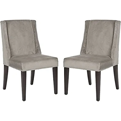 Includes (2) Safavieh Contemporary Dining Chairs. Perfect for the Living Room, Dining Room, Family Room, Den, Library or Study/Office. Color: Mushroom Taupe With Espresso Finish Legs ; Product Dimensions: 55 X 66 X 101.09 cm Wood Content: Birchwood ; Upholstery Content: 100% Cotton Assembly Required: Yes ; Country of Origin: China To prevent overall soiling, frequent vacuuming or light brushing is recommended. Spot clean, using a mild water-free solvent or dry cleaning product. Only a professional cleaner should undertake a complete overall cleaning. The use of steam or water-based cleaners may cause excessive shrinking or staining. Dust regularly with a soft, dry cloth. Never use oiled or treated cloths on lacquered finishes. Some finishes can be wiped with a damp (not wet) cloth, followed at once by rubbing with a dry cloth to remove fingerprints and smudges. For persistent spots, gently clean with a soft cloth and a solution of water and mild soap, make sure to wipe dry.