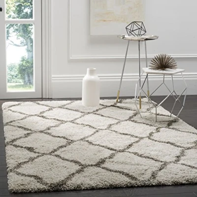 TRENDY STYLE: Shaggy rug design from the Safavieh Hudson Shag Collection woven in Turkey beautifully enhances any room of the home, from the living room, dining room, bedroom, home office, or entryway. Available in many colors and sizes. HIGH QUALITY & DURABLE DESIGN: Woven of Polypropylene this machine made area rug has a plush & comfortable 5 cm high pile and is soft underfoot. STAIN RESISTANT & FAMILY-FRIENDLY: Expertly woven from enhanced soft synthetic durable fibers that are stain resistant and non-shedding, the rug doesn't trap dirt or debris making it pet-friendly and easy to clean. Perfect for high traffic areas. EASY CARE & MAINTENANCE: Vacuum regularly and gently blot and clean stains immediately with a mild detergent or carpet cleaner, then rinse thoroughly and dry. Professional cleaning recommended for tough stains and dirt. THE BRAND: Safavieh has been a trusted brand and global leader in home & living for over 100 Years. Experts in making quality, durable, trendy designs, the brand mixes materials, colors and styles to create a collection of rugs, furniture and lights Construction Type: Power Loomed; Material: Polypropylene Size: 154 X 228 cm; Colour: Ivory / Grey Vacuum regularly to prevent dust and crumbs from settling into the roots of the fibres. Avoid direct and continuous exposure to sunlight. Use rug protectors under the legs of heavy furniture to avoid flattening piles. Do not pull loose ends; clip them with scissors to remove. Turn carpet occasionally to equalize wear. Remove spills immediately. Professional cleaning is recommended.
