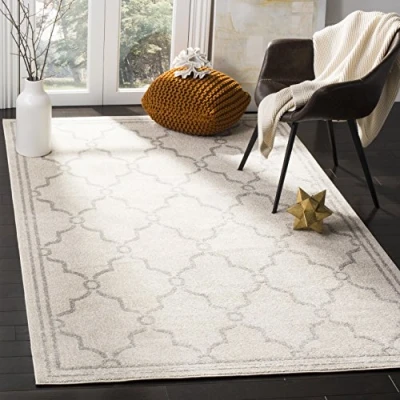 TRENDY STYLE: Trellis rug design from the Safavieh Amherst Collection woven in Turkey enhances any outdoor space. This durable design can also be used for kitchen, playroom, nursery or any high traffic area. Available in many colors and sizes. HIGH QUALITY & DURABLE DESIGN: Woven of 67% Polypropylene / 18% Fibrillated Polypropylene / 8% Latex / 7% Poly-Cotton this machine made area rug has a plush & comfortable 0.95 cm low pile and is soft underfoot. STAIN RESISTANT & FAMILY-FRIENDLY: Expertly woven from enhanced soft synthetic durable fibers that are stain resistant and non-shedding, the rug doesn't trap dirt or debris making it pet-friendly and easy to clean. Perfect for high traffic areas. EASY CARE & MAINTENANCE: Outdoor rugs are made from fibers that are water and stain resistant and deter mildew to withstand natural weather elements. Rinse with a garden hose to remove excessive grime. Dry over a railing in the sun on both sides. THE BRAND: Safavieh has been a trusted brand and global leader in home & living for over 100 Years. Experts in making quality, durable, trendy designs, the brand mixes materials, colors and styles to create a collection of rugs, furniture and lights Construction Type: Power Loomed; Material: 67% Polypropylene 18% Fibrillated Polypropylene 8% Latex 7% Poly-Cotton(Warp) Size: 152 X 243 cm; Colour: Ivory / Light Grey Vacuum regularly to prevent dust and crumbs from settling into the roots of the fibres. Avoid direct and continuous exposure to sunlight. Use rug protectors under the legs of heavy furniture to avoid flattening piles. Do not pull loose ends; clip them with scissors to remove. Turn carpet occasionally to equalize wear. Remove spills immediately. Professional cleaning is recommended.