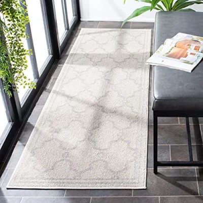 TRENDY STYLE: Trellis rug design from the Safavieh Amherst Collection woven in Turkey enhances any outdoor space. This durable design can also be used for kitchen, playroom, nursery or any high traffic area. Available in many colors and sizes. HIGH QUALITY & DURABLE DESIGN: Woven of 67% Polypropylene / 18% Fibrillated Polypropylene / 8% Latex / 7% Poly-Cotton this machine made area rug has a plush & comfortable 0.95 cm low pile and is soft underfoot. STAIN RESISTANT & FAMILY-FRIENDLY: Expertly woven from enhanced soft synthetic durable fibers that are stain resistant and non-shedding, the rug doesn't trap dirt or debris making it pet-friendly and easy to clean. Perfect for high traffic areas. EASY CARE & MAINTENANCE: Outdoor rugs are made from fibers that are water and stain resistant and deter mildew to withstand natural weather elements. Rinse with a garden hose to remove excessive grime. Dry over a railing in the sun on both sides. THE BRAND: Safavieh has been a trusted brand and global leader in home & living for over 100 Years. Experts in making quality, durable, trendy designs, the brand mixes materials, colors and styles to create a collection of rugs, furniture and lights Construction Type: Power Loomed; Material: 67% Polypropylene 18% Fibrillated Polypropylene 8% Latex 7% Poly-Cotton(Warp) Size: 68 X 213 cm; Colour: Ivory / Light Grey Vacuum regularly to prevent dust and crumbs from settling into the roots of the fibres. Avoid direct and continuous exposure to sunlight. Use rug protectors under the legs of heavy furniture to avoid flattening piles. Do not pull loose ends; clip them with scissors to remove. Turn carpet occasionally to equalize wear. Remove spills immediately. Professional cleaning is recommended.
