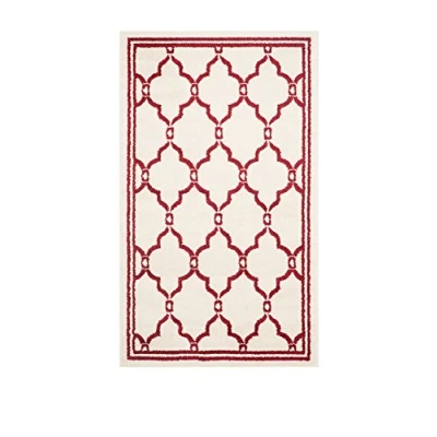 TRENDY STYLE: Trellis rug design from the Safavieh Amherst Collection woven in Turkey enhances any outdoor space. This durable design can also be used for kitchen, playroom, nursery or any high traffic area. Available in many colors and sizes. HIGH QUALITY & DURABLE DESIGN: Woven of 67% Polypropylene / 18% Fibrillated Polypropylene / 8% Latex / 7% Poly-Cotton this machine made area rug has a plush & comfortable 0.95 cm low pile and is soft underfoot. STAIN RESISTANT & FAMILY-FRIENDLY: Expertly woven from enhanced soft synthetic durable fibers that are stain resistant and non-shedding, the rug doesn't trap dirt or debris making it pet-friendly and easy to clean. Perfect for high traffic areas. EASY CARE & MAINTENANCE: Outdoor rugs are made from fibers that are water and stain resistant and deter mildew to withstand natural weather elements. Rinse with a garden hose to remove excessive grime. Dry over a railing in the sun on both sides. THE BRAND: Safavieh has been a trusted brand and global leader in home & living for over 100 Years. Experts in making quality, durable, trendy designs, the brand mixes materials, colors and styles to create a collection of rugs, furniture and lights Construction Type: Power Loomed; Material: 67% Polypropylene 18% Fibrillated Polypropylene 8% Latex 7% Poly-Cotton(Warp) Size: 91 X 152 cm; Colour: Ivory / Red Vacuum regularly to prevent dust and crumbs from settling into the roots of the fibres. Avoid direct and continuous exposure to sunlight. Use rug protectors under the legs of heavy furniture to avoid flattening piles. Do not pull loose ends; clip them with scissors to remove. Turn carpet occasionally to equalize wear. Remove spills immediately. Professional cleaning is recommended.
