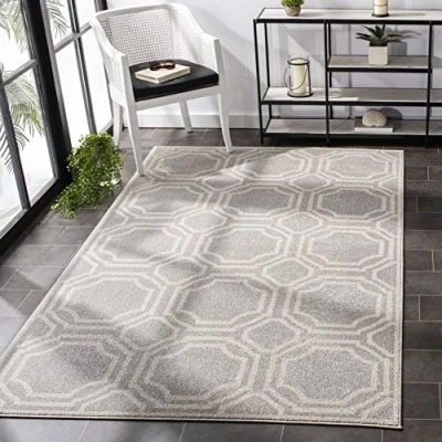 TRENDY STYLE: Geometric rug design from the Safavieh Amherst Collection woven in Turkey enhances any outdoor space. This durable design can also be used for kitchen, playroom, nursery or any high traffic area. Available in many colors and sizes. HIGH QUALITY & DURABLE DESIGN: Woven of 67% Polypropylene / 18% Fibrillated Polypropylene / 8% Latex / 7% Poly-Cotton this machine made area rug has a plush & comfortable 0.95 cm low pile and is soft underfoot. STAIN RESISTANT & FAMILY-FRIENDLY: Expertly woven from enhanced soft synthetic durable fibers that are stain resistant and non-shedding, the rug doesn't trap dirt or debris making it pet-friendly and easy to clean. Perfect for high traffic areas. EASY CARE & MAINTENANCE: Outdoor rugs are made from fibers that are water and stain resistant and deter mildew to withstand natural weather elements. Rinse with a garden hose to remove excessive grime. Dry over a railing in the sun on both sides. THE BRAND: Safavieh has been a trusted brand and global leader in home & living for over 100 Years. Experts in making quality, durable, trendy designs, the brand mixes materials, colors and styles to create a collection of rugs, furniture and lights Construction Type: Power Loomed; Material: 67% Polypropylene 18% Fibrillated Polypropylene 8% Latex 7% Poly-Cotton(Warp) Size: 121 X 182 cm; Colour: Light Grey / Ivory Vacuum regularly to prevent dust and crumbs from settling into the roots of the fibres. Avoid direct and continuous exposure to sunlight. Use rug protectors under the legs of heavy furniture to avoid flattening piles. Do not pull loose ends; clip them with scissors to remove. Turn carpet occasionally to equalize wear. Remove spills immediately. Professional cleaning is recommended.