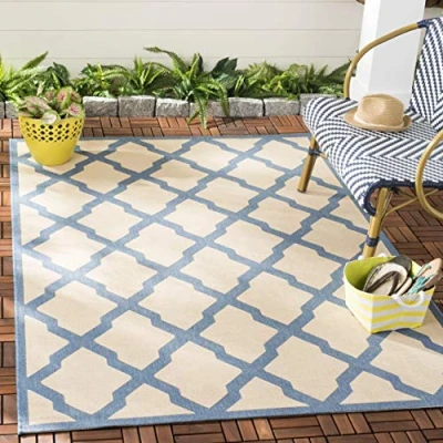 TRENDY STYLE: Trellis rug design from the Safavieh Beachhouse Collection woven in Ukraine enhances any outdoor space. This durable design can also be used for kitchen, playroom, nursery or any high traffic area. Available in many colors and sizes. HIGH QUALITY & DURABLE DESIGN: Woven of 80% Polypropylene / 20% Polyester this machine made area rug has a plush & comfortable 0.05 cm low pile and is soft underfoot. STAIN RESISTANT & FAMILY-FRIENDLY: Expertly woven from enhanced soft synthetic durable fibers that are stain resistant and non-shedding, the rug doesn't trap dirt or debris making it pet-friendly and easy to clean. Perfect for high traffic areas. EASY CARE & MAINTENANCE: Outdoor rugs are made from fibers that are water and stain resistant and deter mildew to withstand natural weather elements. Rinse with a garden hose to remove excessive grime. Dry over a railing in the sun on both sides. THE BRAND: Safavieh has been a trusted brand and global leader in home & living for over 100 Years. Experts in making quality, durable, trendy designs, the brand mixes materials, colors and styles to create a collection of rugs, furniture and lights