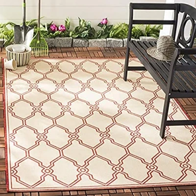 TRENDY STYLE: Trellis rug design from the Safavieh Beachhouse Collection woven in Ukraine enhances any outdoor space. This durable design can also be used for kitchen, playroom, nursery or any high traffic area. Available in many colors and sizes. HIGH QUALITY & DURABLE DESIGN: Woven of 80% Polypropylene / 20% Polyester this machine made area rug has a plush & comfortable 0.05 cm low pile and is soft underfoot. STAIN RESISTANT & FAMILY-FRIENDLY: Expertly woven from enhanced soft synthetic durable fibers that are stain resistant and non-shedding, the rug doesn't trap dirt or debris making it pet-friendly and easy to clean. Perfect for high traffic areas. EASY CARE & MAINTENANCE: Outdoor rugs are made from fibers that are water and stain resistant and deter mildew to withstand natural weather elements. Rinse with a garden hose to remove excessive grime. Dry over a railing in the sun on both sides. THE BRAND: Safavieh has been a trusted brand and global leader in home & living for over 100 Years. Experts in making quality, durable, trendy designs, the brand mixes materials, colors and styles to create a collection of rugs, furniture and lights