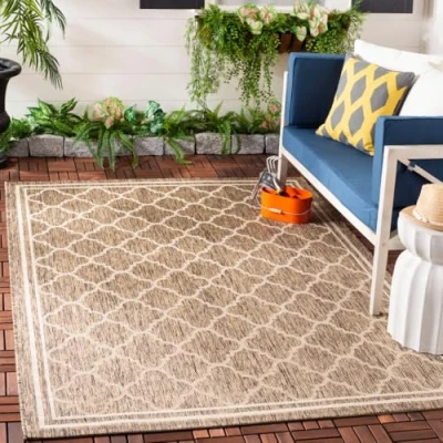 TRENDY STYLE: Trellis rug design from the Safavieh Courtyard Collection woven in Turkey enhances any outdoor space. This durable design can also be used for kitchen, playroom, nursery or any high traffic area. Available in many colors and sizes. HIGH QUALITY & DURABLE DESIGN: Woven of 100% Polypropylene Pile / Latex Backing this machine made area rug has a plush & comfortable 0.5 cm low pile and is soft underfoot. STAIN RESISTANT & FAMILY-FRIENDLY: Expertly woven from enhanced soft synthetic durable fibers that are stain resistant and non-shedding, the rug doesn't trap dirt or debris making it pet-friendly and easy to clean. Perfect for high traffic areas. EASY CARE & MAINTENANCE: Outdoor rugs are made from fibers that are water and stain resistant and deter mildew to withstand natural weather elements. Rinse with a garden hose to remove excessive grime. Dry over a railing in the sun on both sides. THE BRAND: Safavieh has been a trusted brand and global leader in home & living for over 100 Years. Experts in making quality, durable, trendy designs, the brand mixes materials, colors and styles to create a collection of rugs, furniture and lights Construction Type: Power Loomed; Material: Polypropylene Size: 121 X 170 cm; Colour: Brown / Bone Vacuum regularly to prevent dust and crumbs from settling into the roots of the fibres. Avoid direct and continuous exposure to sunlight. Use rug protectors under the legs of heavy furniture to avoid flattening piles. Do not pull loose ends; clip them with scissors to remove. Turn carpet occasionally to equalize wear. Remove spills immediately. Professional cleaning is recommended.