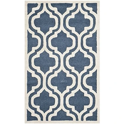 TRENDY STYLE: Trellis rug design from the Safavieh Cambridge Collection hand tufted in India beautifully enhances any room of the home, from the living room, dining room, bedroom, home office, or entryway. Available in many colors and sizes. HIGH QUALITY & DURABLE DESIGN: Woven of 100% Wool Pile this hand tufted area rug has a plush & comfortable 1.2 cm medium pile and is soft underfoot. STAIN RESISTANT & FAMILY-FRIENDLY: Beautifully hand tufted from artisans of the highest quality, soft and dense wool, this carpet is comfortable underfoot. Given the nature of the fibers, this rug is less susceptible to stains. EASY CARE & MAINTENANCE: Vacuum regularly and gently blot and clean stains immediately with a mild detergent or carpet cleaner, then rinse thoroughly and dry. Professional cleaning recommended for tough stains and dirt. THE BRAND: Safavieh has been a trusted brand and global leader in home & living for over 100 Years. Experts in making quality, durable, trendy designs, the brand mixes materials, colors and styles to create a collection of rugs, furniture and lights Construction Type: Hand Tufted; Materials 100% Wool Size: 91 X 152 cm; Colour: Navy / Ivory Vacuum regularly to prevent dust and crumbs from settling into the roots of the fibres. Avoid direct and continuous exposure to sunlight. Use rug protectors under the legs of heavy furniture to avoid flattening piles. Do not pull loose ends; clip them with scissors to remove. Turn carpet occasionally to equalize wear. Remove spills immediately. Professional cleaning is recommended.