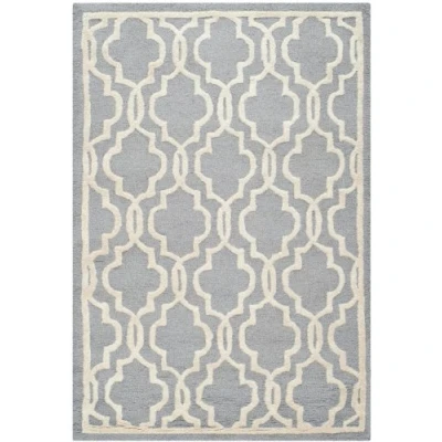 TRENDY STYLE: Trellis rug design from the Safavieh Cambridge Collection hand tufted in India beautifully enhances any room of the home, from the living room, dining room, bedroom, home office, or entryway. Available in many colors and sizes. HIGH QUALITY & DURABLE DESIGN: Woven of 100% Wool Pile this hand tufted area rug has a plush & comfortable 1.2 cm medium pile and is soft underfoot. STAIN RESISTANT & FAMILY-FRIENDLY: Beautifully hand tufted from artisans of the highest quality, soft and dense wool, this carpet is comfortable underfoot. Given the nature of the fibers, this rug is less susceptible to stains. EASY CARE & MAINTENANCE: Vacuum regularly and gently blot and clean stains immediately with a mild detergent or carpet cleaner, then rinse thoroughly and dry. Professional cleaning recommended for tough stains and dirt. THE BRAND: Safavieh has been a trusted brand and global leader in home & living for over 100 Years. Experts in making quality, durable, trendy designs, the brand mixes materials, colors and styles to create a collection of rugs, furniture and lights Construction Type: Hand Tufted; Materials 100% Wool Size: 121 X 182 cm; Colour: Silver / Ivory Vacuum regularly to prevent dust and crumbs from settling into the roots of the fibres. Avoid direct and continuous exposure to sunlight. Use rug protectors under the legs of heavy furniture to avoid flattening piles. Do not pull loose ends; clip them with scissors to remove. Turn carpet occasionally to equalize wear. Remove spills immediately. Professional cleaning is recommended.