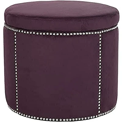 Safavieh Glam Storage Ottoman. Perfect for the Living Room, Dining Room, Family Room, Den, Library or Study/Office. Color: Plum Velvet ; Product Dimensions: 55 X 55 X 48 cm Wood Content: Plywood ; Upholstery Content: Soft Velvet-Poly & CA Foam Fill Assembly Required: No ; Country of Origin: China To prevent overall soiling, frequent vacuuming or light brushing is recommended. Spot clean, using a mild water-free solvent or dry cleaning product. Only a professional cleaner should undertake a complete overall cleaning. The use of steam or water-based cleaners may cause excessive shrinking or staining. Dust regularly with a soft, dry cloth. Never use oiled or treated cloths on lacquered finishes. Some finishes can be wiped with a damp (not wet) cloth, followed at once by rubbing with a dry cloth to remove fingerprints and smudges. For persistent spots, gently clean with a soft cloth and a solution of water and mild soap, make sure to wipe dry.