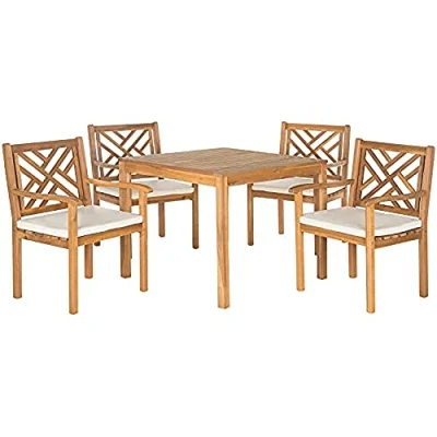 Safavieh Wooden Outdoor 5-Piece Living Set. The Ultimate Entertaining Essential For Your Patio, Constructed Of All-Weather Materials. Color: Teak Brown / Ecru ; Product Dimensions: Square Table: 89.92 L x 89.92 W x 74.93 H CM / Chairs: 57.91 L x 60.96 W x 88.14 H CM / Seat Dimensions: 46.48 D x 49.02 W x 40.89 H CM Wood Content: Acacia Wood ; Upholstery Content: 100% Polyester Assembly Required: Yes ; Country of Origin: Vietnam Store outdoor furniture indoors or cover well when not in use. Remove wooden furniture from standing water. Dust regularly with small brush or vacuum. Spills should be taken care of immediately before they harden or stain with a slightly dampened sponge. Do not use bleach solutions or any formulas not suitable for wooden surfaces. Cushions and pillows should be turned on a frequent basis when in use to keep them looking great.