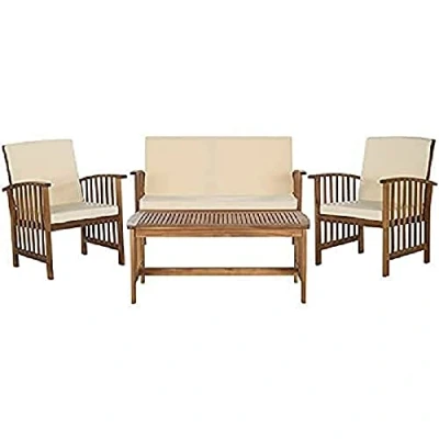 SAFAVIEH Wooden Outdoor Patio Set Cushioned of 4, in Natural and Beige