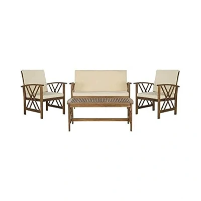 SAFAVIEH Wooden Outdoor Patio Set Cushioned of 4, in Natural and Beige