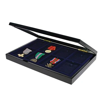 Wooden Case with Piano Lacquer finish Suitable for wall mounting Cover with magnetic catch Compartments for 8 Medals/Decorations Dimensions: 375 x 260 x 38 mm